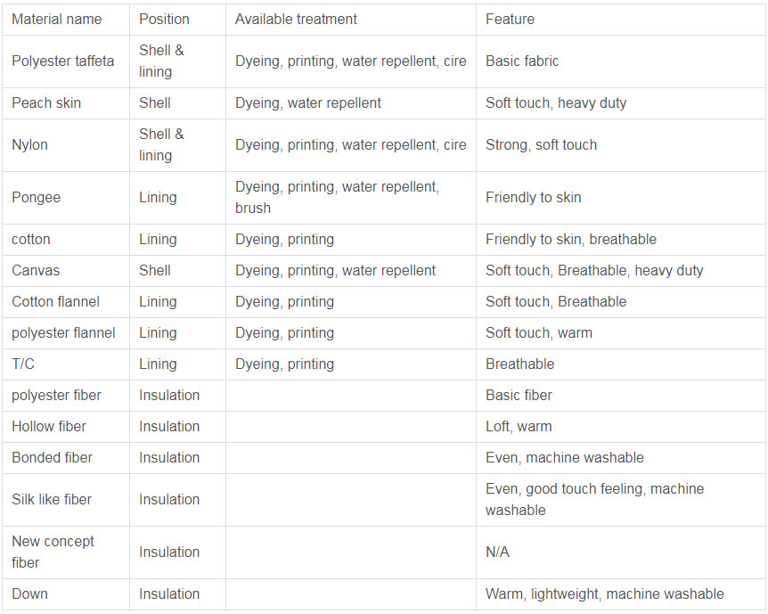 The H Chamber is simplest and most popular construction, sew the shell, insulation and lining together directly. This construction is usually used for summer-spring models